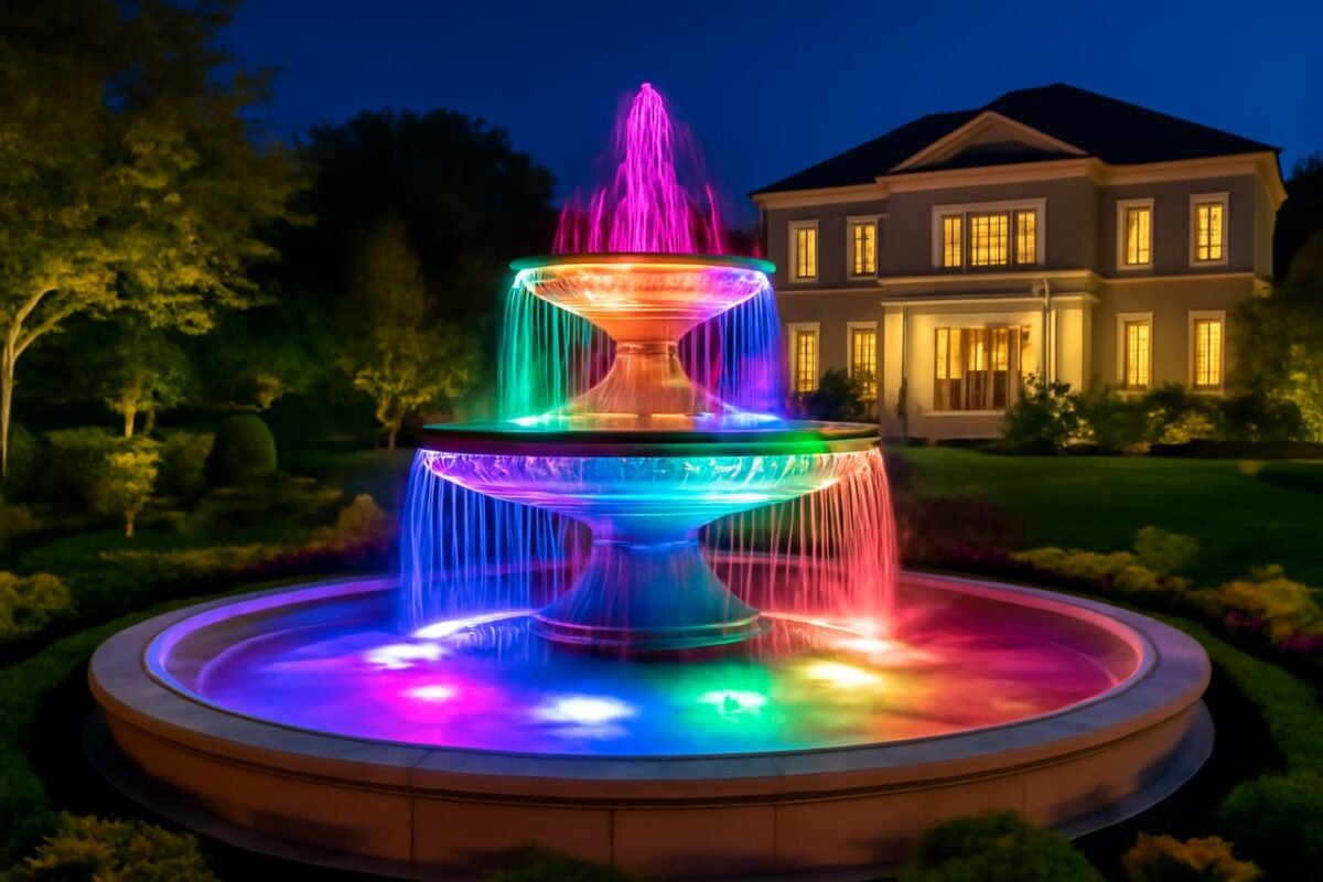 صورة لنافورة ضخمة متعددة الطوابق مضيئة بألوان متدرجة من الأحمر والأزرق والأصفر في حديقة منزلية فاخرة. المياه تتدفق بأناقة بينما تزين الإضاءة الملونة المشهد، مع خلفية فيلا أنيقة وحديقة منسقة بعناية.
