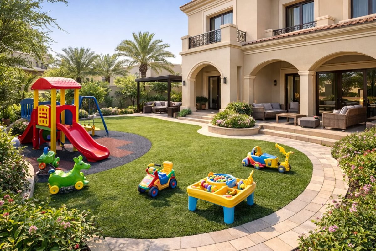 تنسيق حدائق الاطفال بالكويت اترك تعليقاً / بواسطة admin / 18 ديسمبر، 2025 حديقة فيلا فاخرة منسقة تضم ركن أطفال مليء بالألعاب مع ثيل صناعي وجلسات وممرات أنيقة