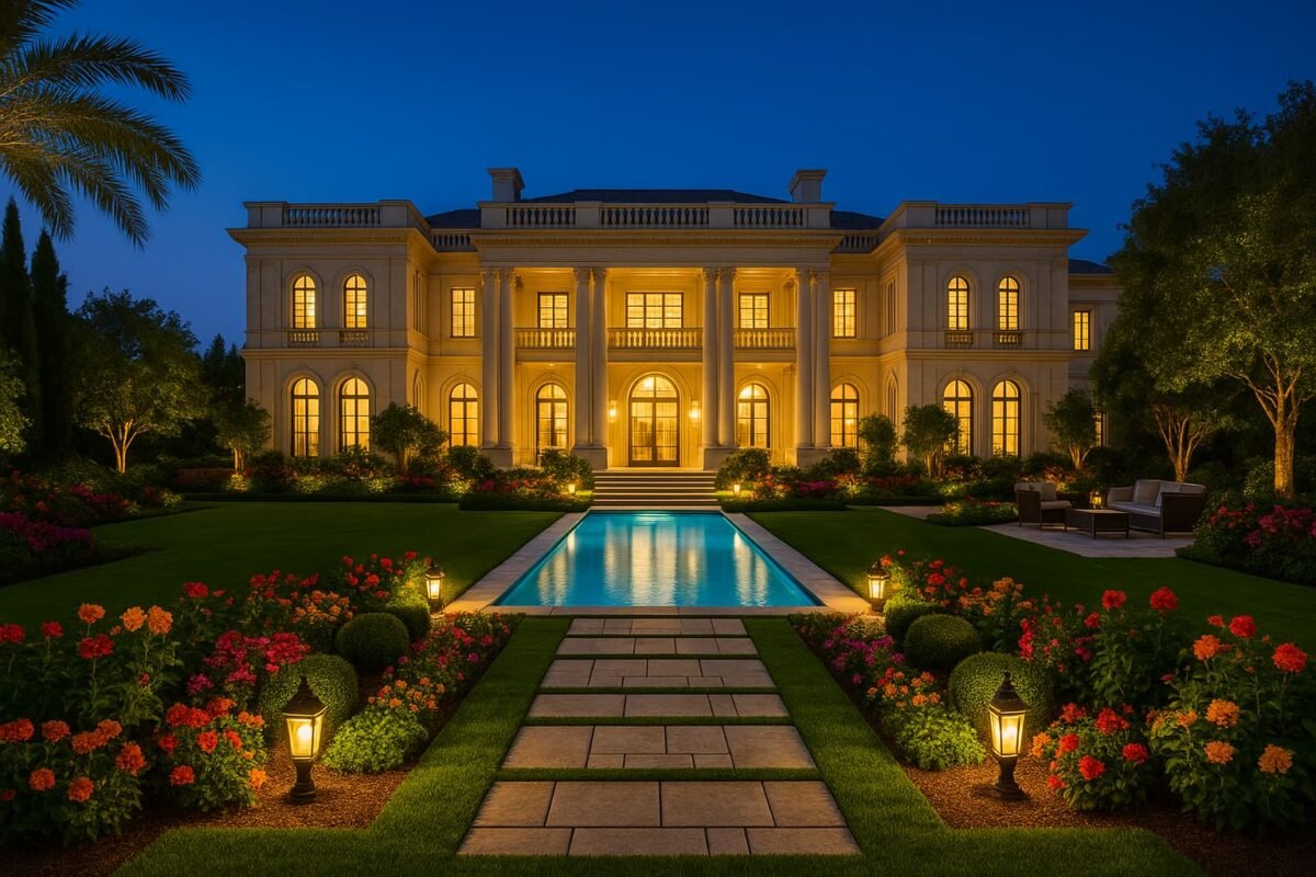 صورة أفقية لحديقة فخمة داخل قصر كبير، تضم مسبحًا طويلًا تحيط به ممرات حجرية مضاءة بقوة، مع تنسيق نباتي راقٍ وزهور ملونة وجلسات خارجية، ويظهر القصر الضخم في الخلفية بإضاءة ليلية تزيد المشهد فخامة.