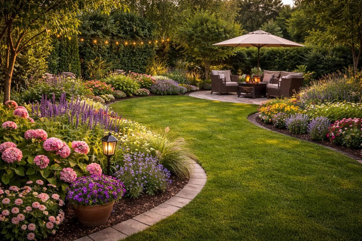 حديقة منسقة مع ثيل أخضر وممر منحني وأحواض زهور وجلسة مريحة
