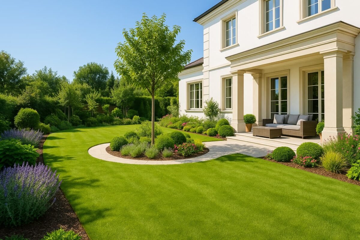 حديقة منزلية واسعة بداخل فيلا فاخرة تضم مسطحات خضراء ونباتات منسقة تمنح المكان مظهرًا راقيًا