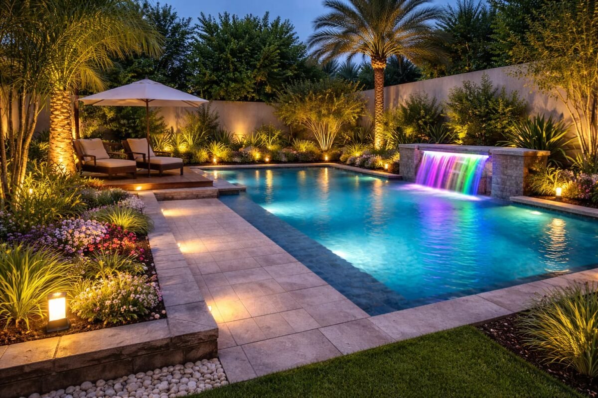 شركة تنسيق حدائق اشبيلة اترك تعليقاً / بواسطة admin / 31 ديسمبر، 2025 حديقة منسقة تضم مسبحًا مستطيلًا ونافورة مضيئة بألوان متعددة مع إضاءة ليلية قوية حول النباتات والممرات والجلسة