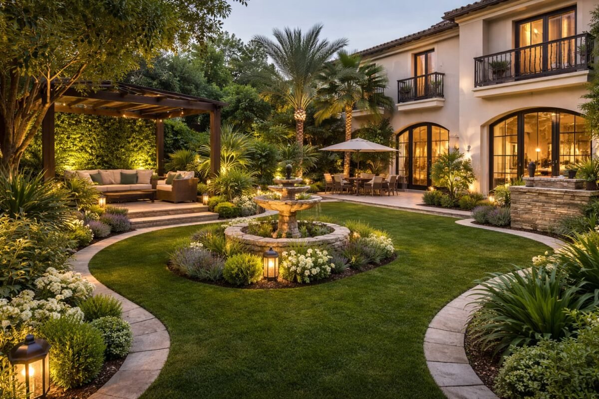 شركة تنسيق حدائق الرحاب اترك تعليقاً / بواسطة admin / 21 ديسمبر، 2025 صورة حديقة فخمة بثيل أخضر ومسارات منحنية وجلسة تحت برغولا مع إضاءة ونباتات كثيفة منظمة
