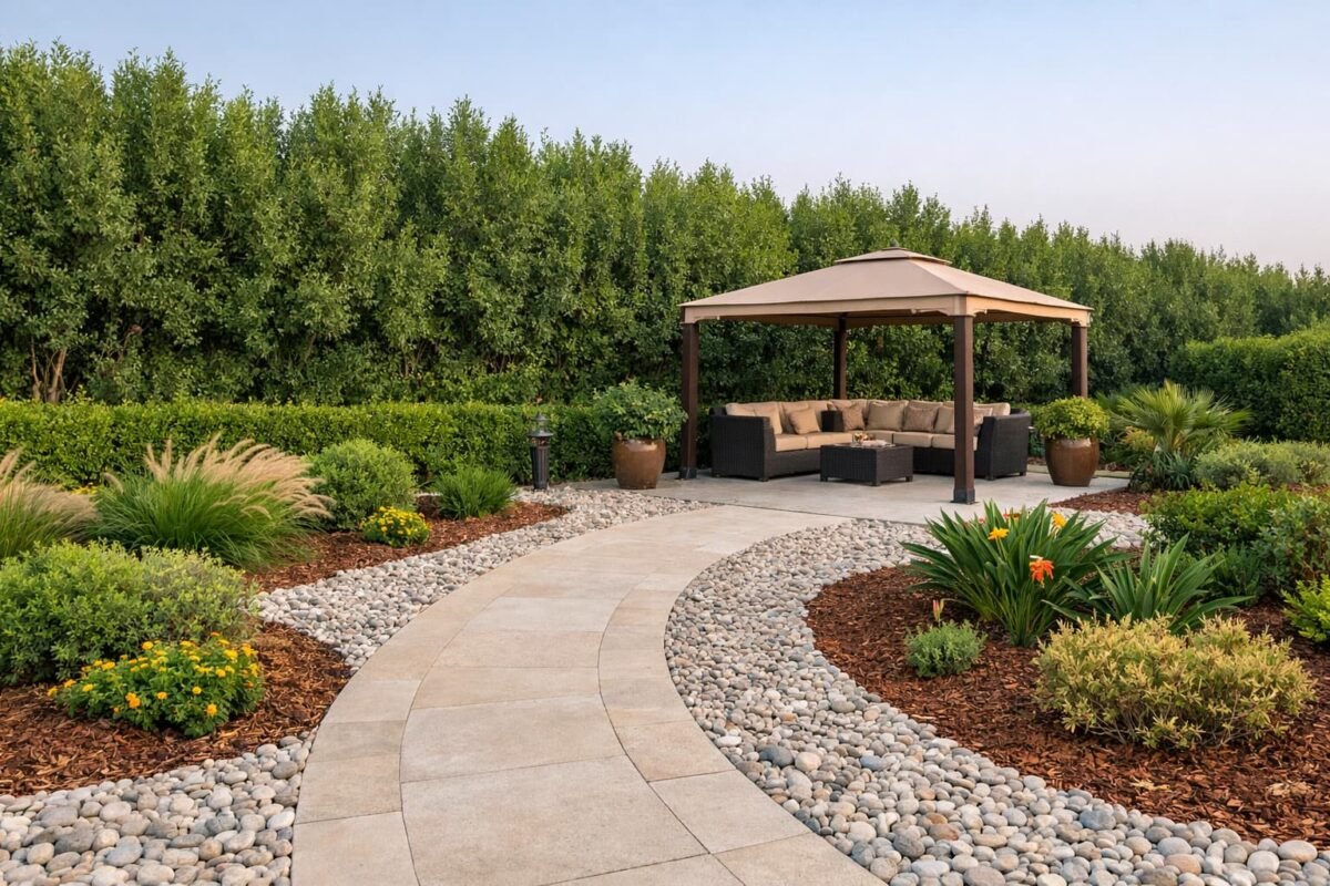 مشهد أفقي لحديقة بالشعيبة يظهر حزام نباتي كثيف كمصد للرياح مع أرضية حصى ديكوري وملش عضوي حول النباتات وممر واضح سهل التنظيف وجلسة خارجية محمية نسبيًا
