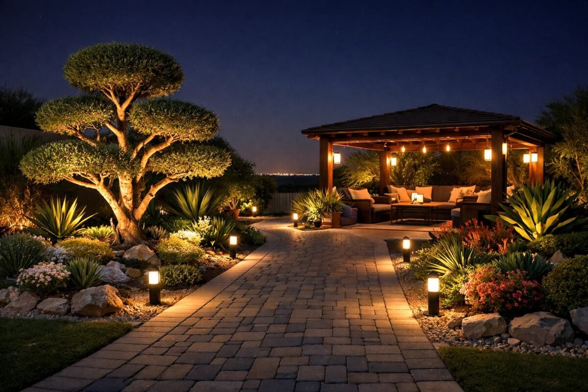 حديقة منزل في كاظمة: سبوتات أرضية على جانبي ممر الإنترلوك مع إضاءة مركزة تُبرز شجرة زينة وجلسة خارجية دافئة تحت برجولة ونباتات طبقية مقاومة للحرارة