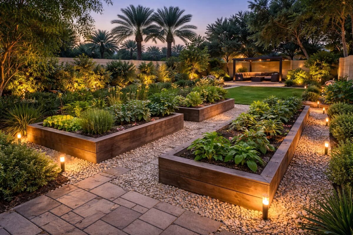 شركة تنسيق حدائق كبد اترك تعليقاً / بواسطة admin / 23 ديسمبر، 2025 ركن زراعة داخل مزرعة بكبد يضم أحواضًا مرتفعة أنيقة ومسار حصى ونباتات خضراء مع خلفية نخيل وإضاءة خافتة