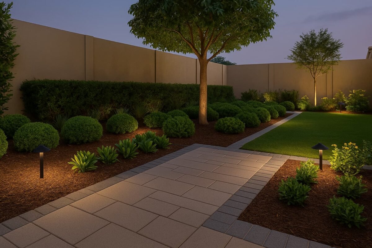 حديقة مكتملة بتشطيبات دقيقة تضم ممرًا ثابتًا بحواف واضحة وأحواضًا بملش مرتب وشجرة ظل مع حلقة حصى وإنارة أرضية موزعة بعناية بدون وهج